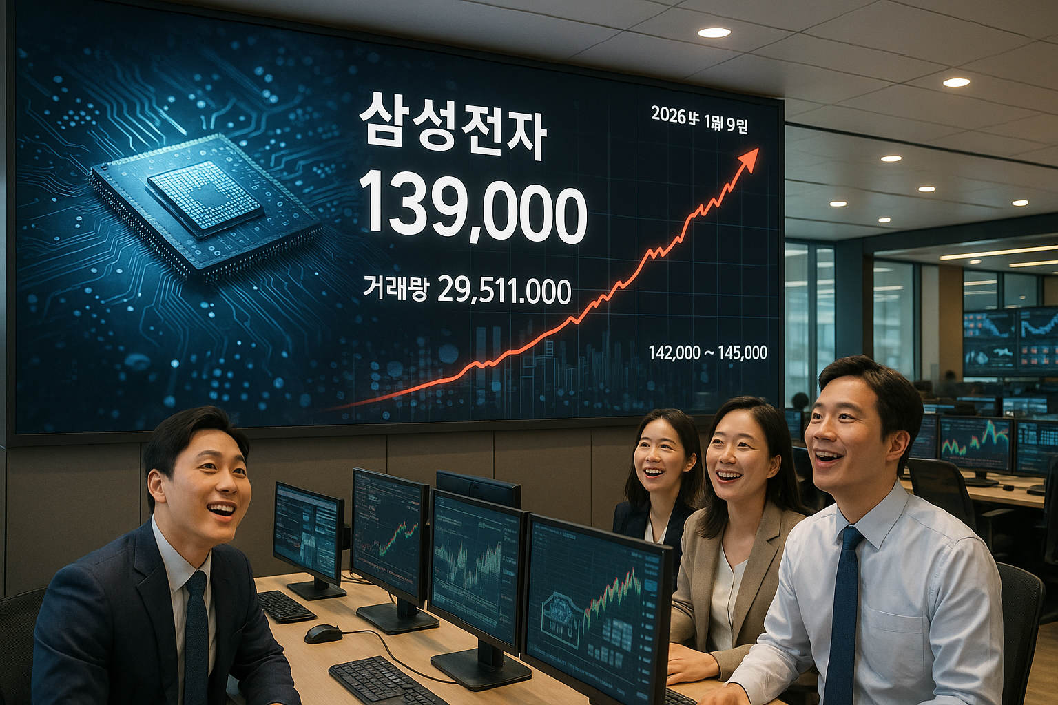 금일 주도주 삼성전자 내일 주가 예측: 2026년 1월 9일 기준 삼성전자 주가는 139,000원으로 코스피 상승을 주도하며 거래량 2,951만 주를 기록했다. 반도체 호황과 HBM 수요 증가로 내일 142,000~145,000원 상승 전망이며, 목표주가 18만~24만원 수준이다. 금일 주도주 삼성전자는 코스피 시장에서 압도적인 거래량과 주가 상승으로 주도주 지위를 확고히 했다. 금일 주도주 삼성전자 동향금일 주도주 삼성전자는 2026년 1월 9일 현재가 139,000원으로 전일 대비 200원(0.14%) 상승하며 마감했다. 거래량은 29,514,279주, 거래대금은 4조 원을 넘어섰으며, 이는 코스피 전체 거래의 큰 비중을 차지한다. 최근 1월 7일 종가 138,800원에서 안정적 상승세를 보였고, ..